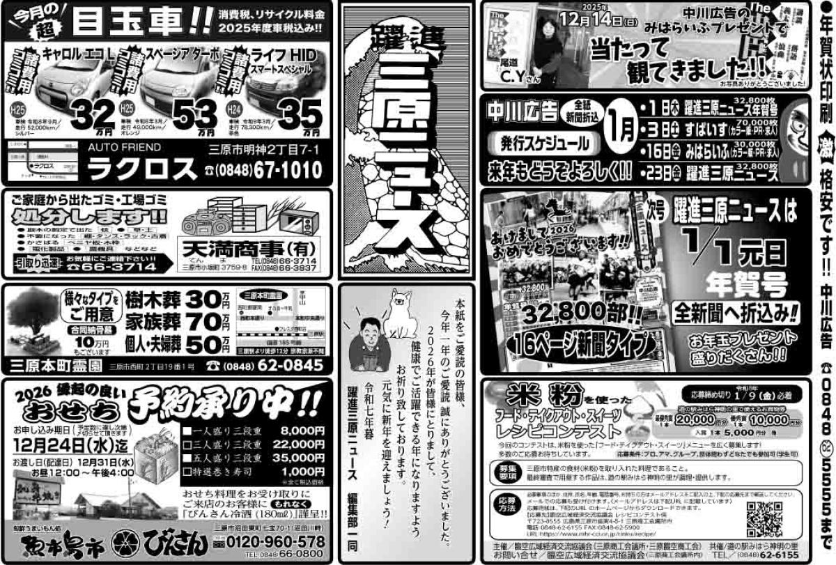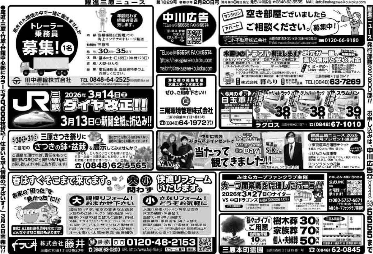 三原市全域、竹原市中心部及び忠海、尾道市美ノ郷町、世羅町中心部に32,800部新聞折込みしており、このHPにも掲載いたします。 ※求人広告のみ、HP内「求人情報」に発行より1ヶ月間掲載いたします。