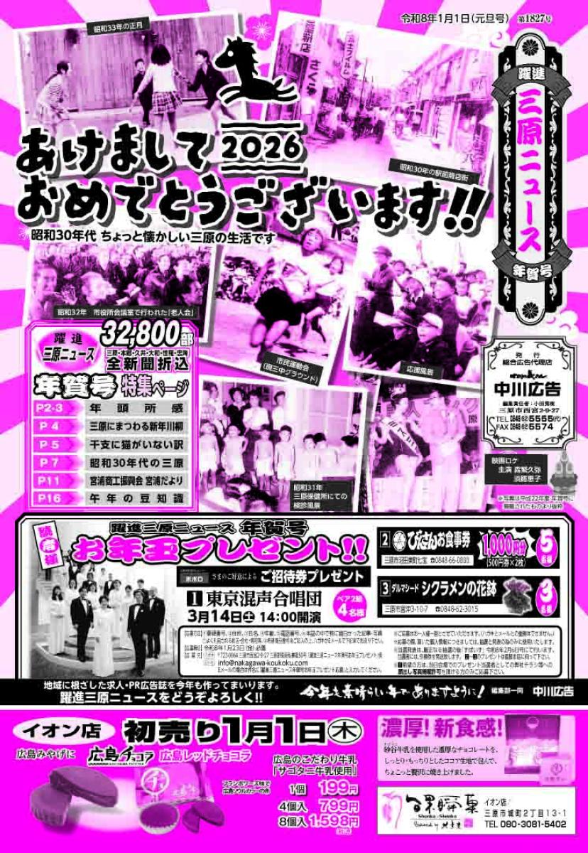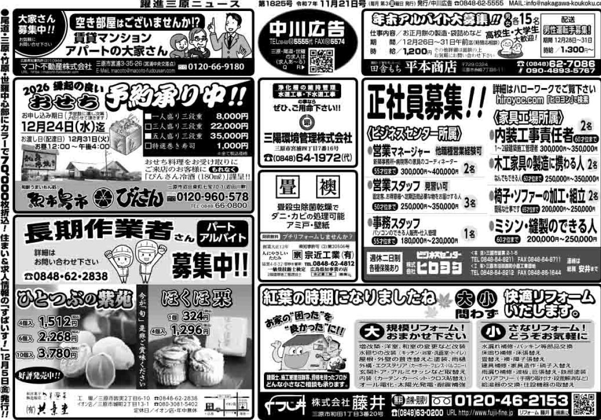 三原市全域、竹原市中心部及び忠海、尾道市美ノ郷町、世羅町中心部に32,800部新聞折込みしており、このHPにも掲載いたします。 ※求人広告のみ、HP内「求人情報」に発行より1ヶ月間掲載いたします。